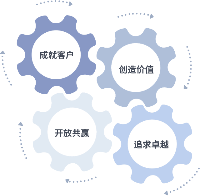 成就客户是一切决策的出发点,,,创造价值是衡量所有工作的标准,,追求卓越是我们做事做人的态度,,开放共赢是我们的格局也是最终的结果。。价值观的齿轮环环相扣,,推动着组织里的每个人不断向前。。。